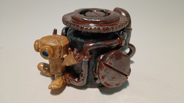『トーキーの蒸気機関』 自分自身も蒸気機関で動いているトーキーは、大型蒸気機関ユニットに親近感を感じています 伏せて置くとオブジェ、ひっくり返すと酒器として使えるリバーシブルになっています。 サイズ縦11cm×横12cm×高さ8cm 写真の木箱に入れてお届けします。 今回の直販用限定で5部だけ作成したストーリーブック(20ページ)をお付けいたします。 ※本作品集は本作品の購入者のために制作したもので、 単体販売・再制作の予定はありません。 送料込みの価格になります。